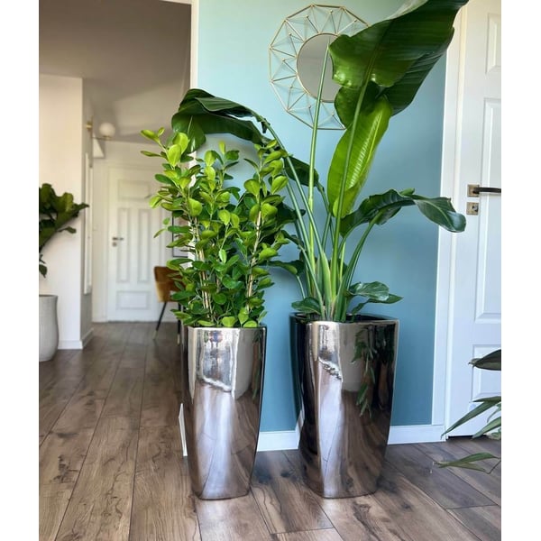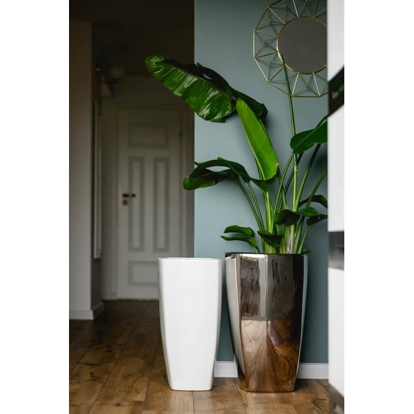 Visoka četvrtasta žardinjera sa zaobljenim kutovima. Izrađena od pocinčane glazirane keramike. Osnova za pečenje je terakota koja se glazira i zatim podvrgava složenom procesu elektrolitskog premazivanja. Zahvaljujući ovom procesu proizvod ima svoj ekskluzivni izgled. Glazura sa srebrnim zrcalom ispunjava vanjski dio žardinjere i unutarnji dio do standardne razine tla (otprilike 10 cm od gornjeg ruba). Preostali dio unutrašnjosti nije prekriven glazurom. Tipično, ovaj dio nije vidljiv nakon sadnje i ne utječe negativno na vizualni prijem. Stilski je proizvod univerzalan - uklapa se u klasično i moderno uređene prostore. Više informacija možete pronaći u odjeljku tehnički podaci. Proizvodi su ručni rad i stvarne dimenzije mogu malo odstupati od deklariranih (+/- 5%). Sadilica je opremljena dodatnim sustavom odvodnje - ima rupu koja se može zatvoriti vodonepropusnim čepom - ovisno o namjeni, rupa se može probušiti ili ostaviti zatvorenom.