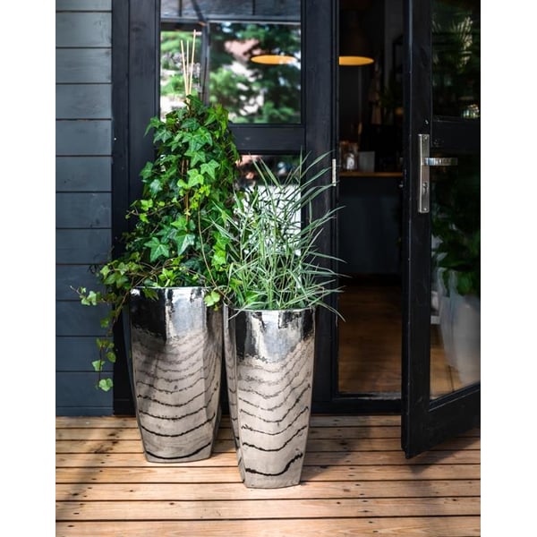 Visoka četvrtasta žardinjera sa zaobljenim kutovima. Izrađena od pocinčane glazirane keramike. Osnova za pečenje je terakota koja se glazira i zatim podvrgava složenom procesu elektrolitskog premazivanja. Zahvaljujući ovom procesu proizvod ima svoj ekskluzivni izgled. Glazura sa srebrnim zrcalom ispunjava vanjski dio žardinjere i unutarnji dio do standardne razine tla (otprilike 10 cm od gornjeg ruba). Preostali dio unutrašnjosti nije prekriven glazurom. Tipično, ovaj dio nije vidljiv nakon sadnje i ne utječe negativno na vizualni prijem. Stilski je proizvod univerzalan - uklapa se u klasično i moderno uređene prostore. Više informacija možete pronaći u odjeljku tehnički podaci. Proizvodi su ručni rad i stvarne dimenzije mogu malo odstupati od deklariranih (+/- 5%). Sadilica je opremljena dodatnim sustavom odvodnje - ima rupu koja se može zatvoriti vodonepropusnim čepom - ovisno o namjeni, rupa se može probušiti ili ostaviti zatvorenom.