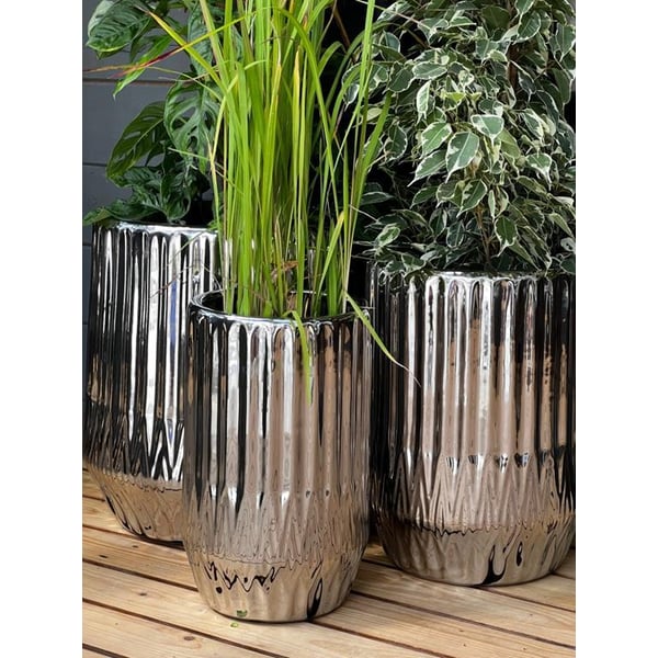 Set od 3 velike okrugle žardinjere, nježno sužene prema vrhu. Proizvod je izrađen od pocinčane glazirane keramike. Osnova za pečenje je terakota koja se glazira, a potom podvrgava kompliciranom procesu elektrolitskog premazivanja. Zahvaljujući ovom procesu proizvod ima svoj ekskluzivni izgled. Srebrno-zrcalna glazura ispunjava vanjski dio žardinjere i unutarnji dio do standardne razine podloge (otprilike 10 cm od gornjeg ruba). Preostali dio unutrašnjosti nije prekriven glazurom. Obično se ovaj dio ne vidi nakon sadnje i ne utječe negativno na vizualnu percepciju. Stilski, proizvod je svestran i prikladan kako za klasične tako i za moderne prostore. Zidovi su ukrašeni geometrijskim uzorkom. Dajemo vanjske dimenzije na najširim mjestima artikla. Za više informacija pogledajte karticu tehničkih podataka. Proizvodi su ručni rad i stvarne dimenzije mogu malo odstupati od deklariranih (+/- 5%). Sadilica je opremljena opcijskim odvodom za vodu - ima rupu koja se može zatvoriti vodootpornim čepom - ovisno o namjeni, rupa se može probušiti ili ostaviti zatvorenom.