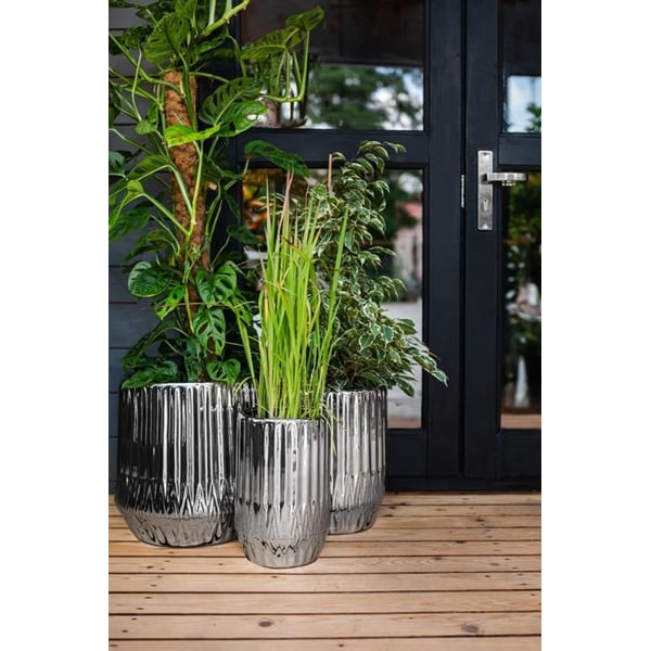 Set od 3 velike okrugle žardinjere, nježno sužene prema vrhu. Proizvod je izrađen od pocinčane glazirane keramike. Osnova za pečenje je terakota koja se glazira, a potom podvrgava kompliciranom procesu elektrolitskog premazivanja. Zahvaljujući ovom procesu proizvod ima svoj ekskluzivni izgled. Srebrno-zrcalna glazura ispunjava vanjski dio žardinjere i unutarnji dio do standardne razine podloge (otprilike 10 cm od gornjeg ruba). Preostali dio unutrašnjosti nije prekriven glazurom. Obično se ovaj dio ne vidi nakon sadnje i ne utječe negativno na vizualnu percepciju. Stilski, proizvod je svestran i prikladan kako za klasične tako i za moderne prostore. Zidovi su ukrašeni geometrijskim uzorkom. Dajemo vanjske dimenzije na najširim mjestima artikla. Za više informacija pogledajte karticu tehničkih podataka. Proizvodi su ručni rad i stvarne dimenzije mogu malo odstupati od deklariranih (+/- 5%). Sadilica je opremljena opcijskim odvodom za vodu - ima rupu koja se može zatvoriti vodootpornim čepom - ovisno o namjeni, rupa se može probušiti ili ostaviti zatvorenom.