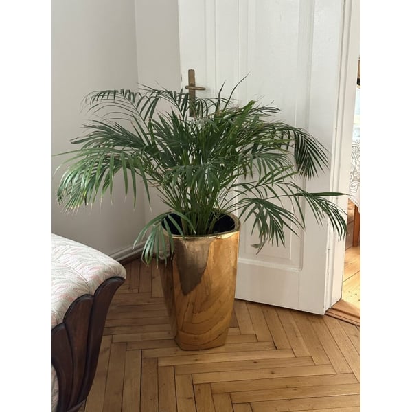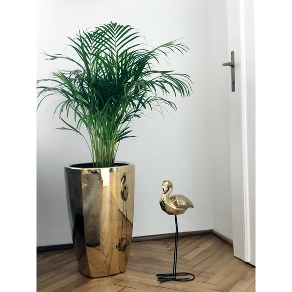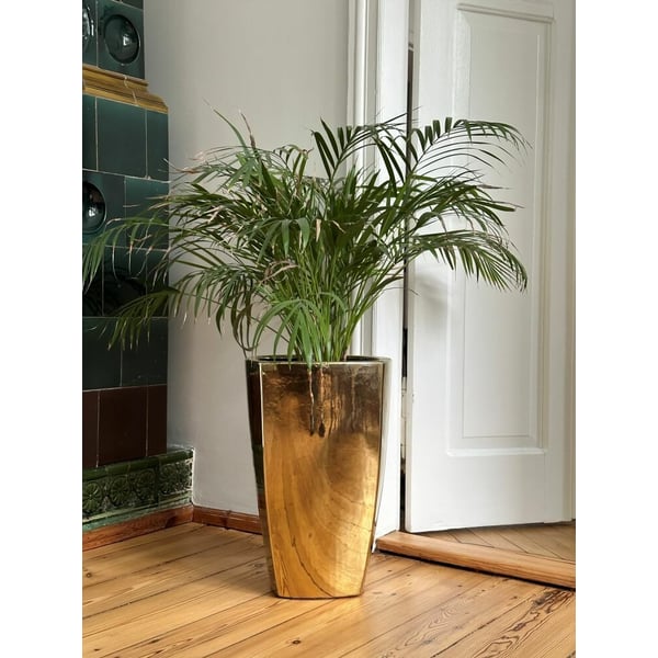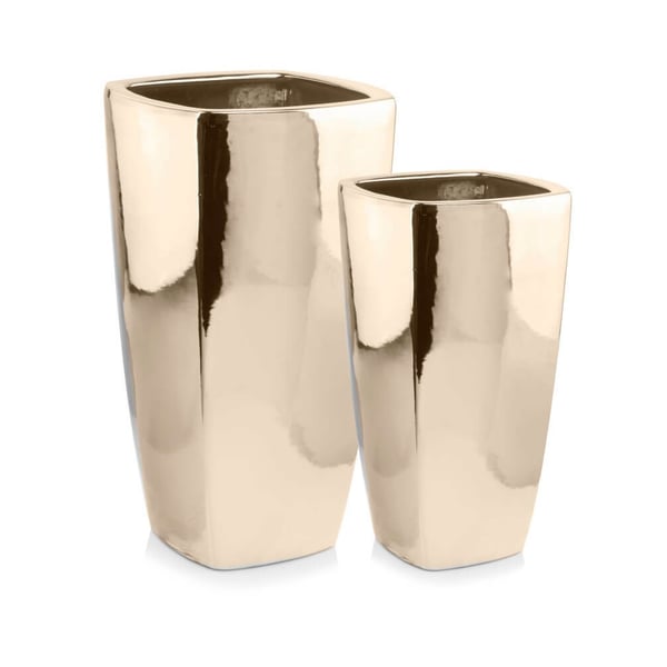 Visoka posuda s kvadratnom bazom i zaobljenim kutovima. Proizvod je izrađen od glazirane pocinčane keramike. Osnova za pečenje je terakota koja se glazira i zatim podvrgava složenom procesu elektrolitskog premazivanja. Upravo zahvaljujući tome proizvodi iz kolekcije Mood imaju svoj ekskluzivan izgled. Zlatno-zrcalna glazura ispunjava vanjski dio posude i unutarnji dio do standardne razine podloge (otprilike 10 cm od gornjeg ruba). Preostali dio unutrašnjosti nije prekriven glazurom. Tipično, ovaj dio nije vidljiv nakon sadnje i ne utječe negativno na vizualni izgled. Stilski je proizvod svestran - uklapa se kako u klasično tako iu moderno uređene prostore. Posuda je opremljena opcijskim izlazom za vodu - ima rupu koja se može začepiti vodonepropusnim čepom - ovisno o namjeni, rupa se može probušiti ili ostaviti zatvorenom. Posude dolaze u kompletu od dvije. Više informacija možete pronaći u kartici tehnički podaci. Proizvodi su ručni rad i stvarne dimenzije mogu malo odstupati od deklariranih (+/- 5%).