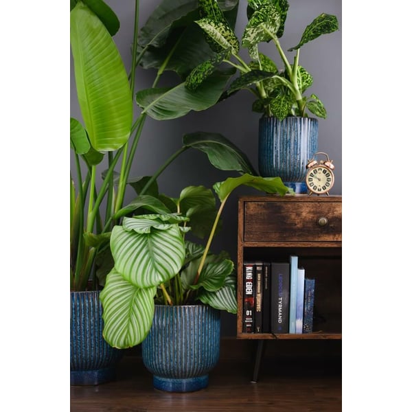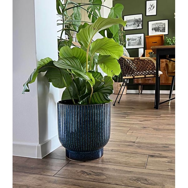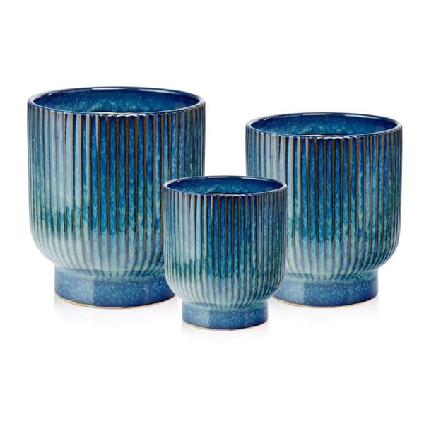 Posuda za biljke s okruglim postoljem izrađena je od glazirane keramike, što joj daje iznimnu izdržljivost i eleganciju. Cijela površina je rezbarena, s prirodno oblikovanim prugama koje je čine jedinstvenom. Duboka i bogato zasićena plava boja svakom će interijeru dodati dašak klase i sofisticiranosti. Posude dolaze u kompletu od tri. Više informacija možete pronaći u kartici tehnički podaci. Ovi proizvodi su ručne izrade i stvarne dimenzije mogu malo odstupati od deklariranih (+/- 5%).