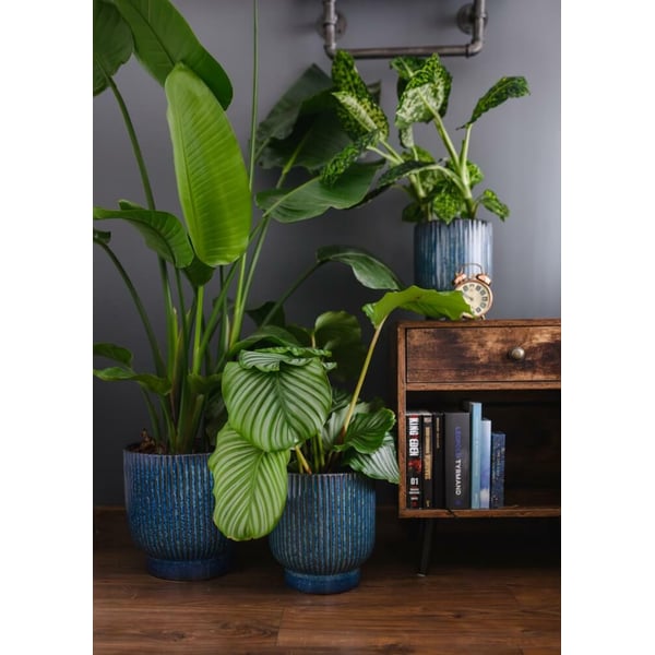 Posuda za biljke s okruglim postoljem izrađena je od glazirane keramike, što joj daje iznimnu izdržljivost i eleganciju. Cijela površina je rezbarena, s prirodno oblikovanim prugama koje je čine jedinstvenom. Duboka i bogato zasićena plava boja svakom će interijeru dodati dašak klase i sofisticiranosti. Posude dolaze u kompletu od tri. Više informacija možete pronaći u kartici tehnički podaci. Ovi proizvodi su ručne izrade i stvarne dimenzije mogu malo odstupati od deklariranih (+/- 5%).