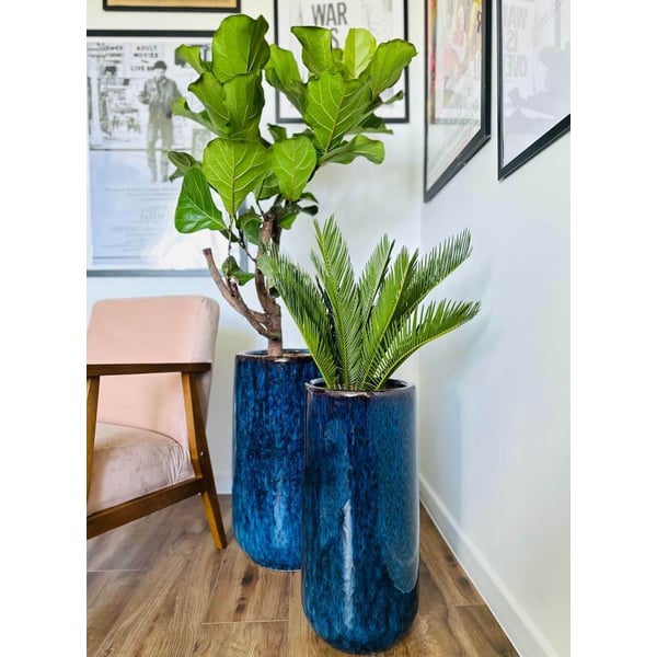Visoka posuda s okruglim postoljem izrađena je od glazirane keramike, što joj daje iznimnu izdržljivost i eleganciju. Cijela površina posuda je glatka i sjajna, s prirodno oblikovanim prugama koje je čine jedinstvenom i jedinstvenom. Duboka i bogato zasićena plava boja svakom će interijeru dodati dašak klase i sofisticiranosti. Artikal dolazi s izbornom drenažnom rupom - postoji rupa koja se može začepiti vodonepropusnim čepom, ovisno o vašim potrebama, rupa se može probušiti ili ostaviti zatvorenom. Posude dolaze u kompletu od dvije. Više informacija možete pronaći u kartici tehnički podaci. Ovi proizvodi su ručne izrade i stvarne dimenzije mogu malo odstupati od deklariranih (+/- 5%).