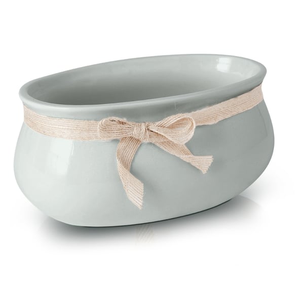 Ovalna keramička žardinjera bačvastog dizajna, ukrašena vrpcom. Proizvod je izrađen od glazirane keramike. Više informacija možete pronaći u kartici tehnički podaci. Proizvodi su ručni rad i stvarne dimenzije mogu malo odstupati od deklariranih (+/- 5%).