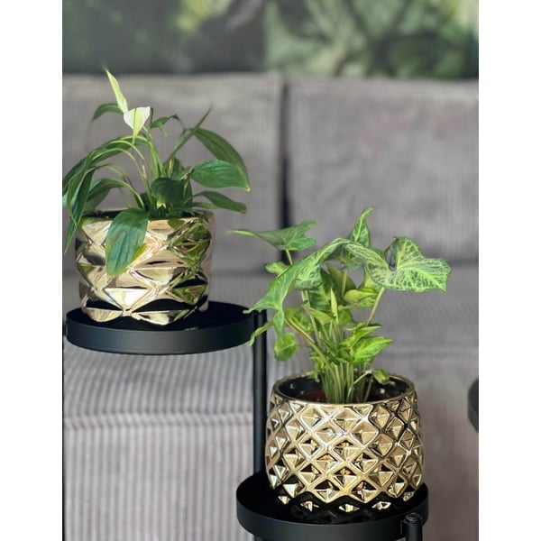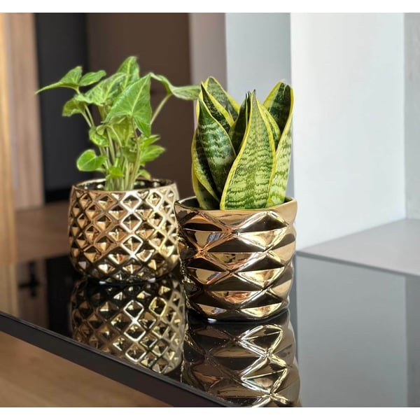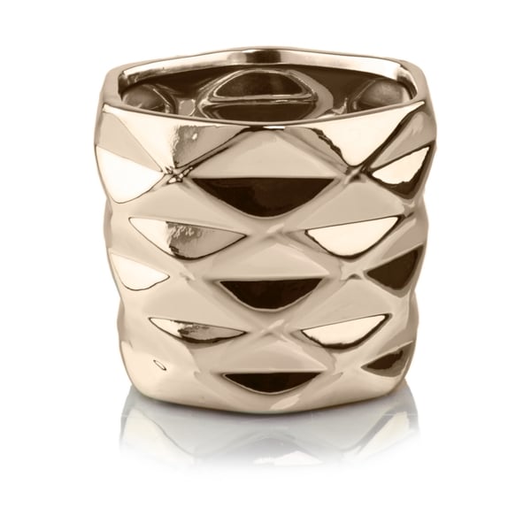 Okrugla posuda za biljke. Artikl je izrađen od keramike tankih stijenki i završne obrade visokokvalitetnom zrcalno zlatnom glazurom. Zahvaljujući procesu galvanizacije, površina proizvoda je glatka i reflektira okolinu poput zrcala. Nijansa zlata poznata je kao "zlato boje šampanjca", koju karakterizira nježna, hladna boja. Elektrolitičko zlato koje mu daje metalni karakter prekriva cijelu površinu predmeta, uključujući i unutrašnjost. Zidovi su ukrašeni geometrijskim uzorcima. Više informacija možete pronaći u kartici tehnički podaci. Proizvodi su ručni rad i stvarne dimenzije mogu malo odstupati od deklariranih (+/- 5%).