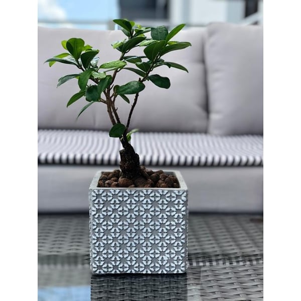 Keramička posuda u obliku klasične kocke (kubična forma). Materijal od kojeg je izrađen nalikuje teksturi betona - brojne abrazije i pukotine na površini su namjerne. Zidovi su mu ukrašeni geometrijskim uzorcima. Minimalizam i prirodnost su snaga i ljepota ove posude - ne opterećuje biljke koje su u njoj izložene. Ovaj će predmet izgledati sjajno u interijerima u kojima vladaju dodaci i akcenti inspirirani boho stilom ili u modernijem okruženju. Više informacija možete pronaći u kartici tehnički podaci. Proizvodi su ručni rad i stvarne dimenzije mogu neznatno odstupati od deklariranih (+/- 5%).