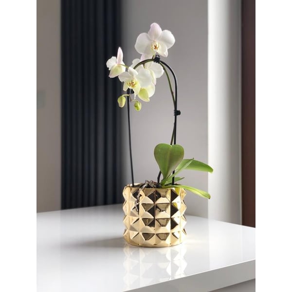 Posuda u obliku cilindra. Artikl je izrađen od keramike tankih stijenki i završne obrade visokokvalitetnom zrcalno zlatnom glazurom. Zahvaljujući procesu galvanizacije, površina proizvoda je glatka i reflektira okolinu poput zrcala. Zidovi tegle su ukrašeni geometrijskim uzorcima. Nijansa zlata poznata je kao šampanjsko zlato, a karakterizira je nježna, hladna boja. Više informacija možete pronaći u kartici tehnički podaci. Proizvodi su ručne izrade i stvarne dimenzije mogu malo odstupati od deklariranih (+/- 5%).