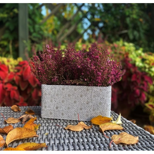 Keramička posuda pravokutnog oblika. Materijal koji se koristi ima teksturu sličnu betonu - namjerne abrazije i pore na površini. Zidovi su ukrašeni geometrijskim uzorcima. Noge su izrađene od drveta čajevca. Minimalizam i prirodnost ove navlake za posude daju joj snagu i ljepotu, a da pritom ne opterećuju biljke koje su u njoj izložene. Ovaj će predmet izgledati sjajno u interijeru u kojem dominiraju dodaci u boho stilu ili usred modernijeg ambijenta. Prikazani pokrov za lonce služi kao ukrasni pokrov - u njega se ne smiju izravno saditi biljke. Više informacija možete pronaći u kartici tehnički podaci. Proizvodi su ručni rad i stvarne dimenzije mogu malo odstupati od deklariranih (+/- 5%).