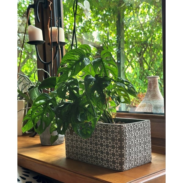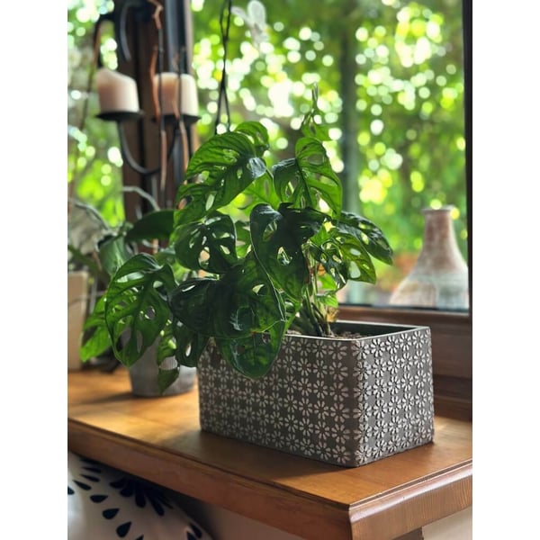 Keramička posuda pravokutnog oblika. Materijal koji se koristi ima teksturu sličnu betonu - namjerne abrazije i pore na površini. Zidovi su ukrašeni geometrijskim uzorcima. Noge su izrađene od drveta čajevca. Minimalizam i prirodnost ove navlake za posude daju joj snagu i ljepotu, a da pritom ne opterećuju biljke koje su u njoj izložene. Ovaj će predmet izgledati sjajno u interijeru u kojem dominiraju dodaci u boho stilu ili usred modernijeg ambijenta. Prikazani pokrov za lonce služi kao ukrasni pokrov - u njega se ne smiju izravno saditi biljke. Više informacija možete pronaći u kartici tehnički podaci. Proizvodi su ručni rad i stvarne dimenzije mogu malo odstupati od deklariranih (+/- 5%).