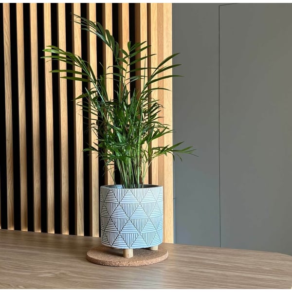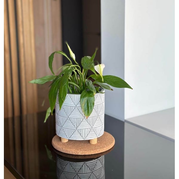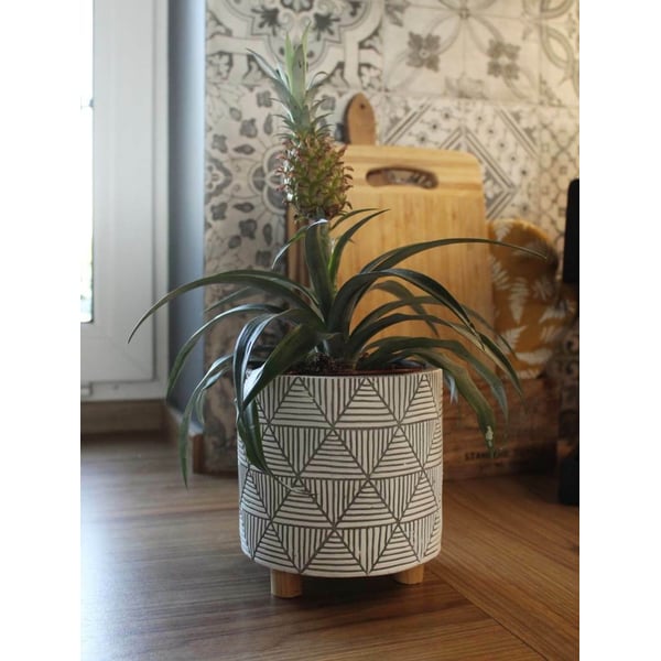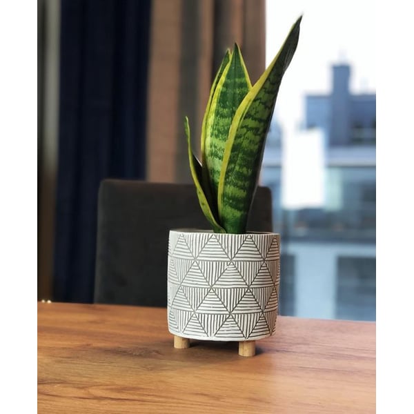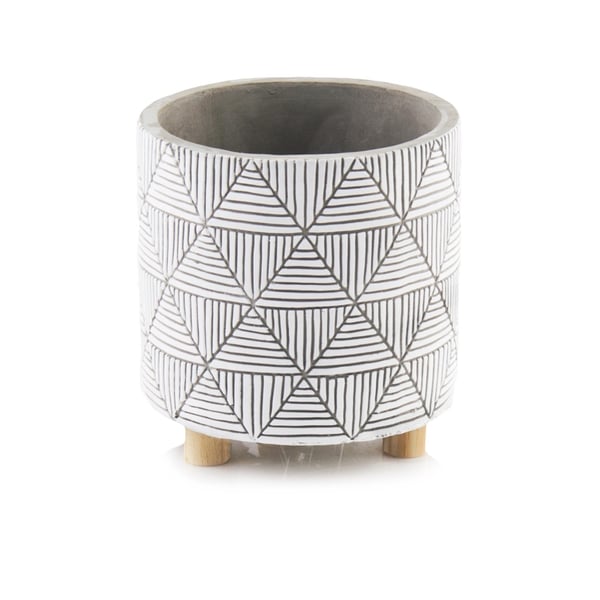 Cilindrična keramička posuda, na drvenim nogama. Materijal od kojeg je izrađen ima teksturu sličnu betonu - brojne ogrebotine i jamice na površini su namjerni elementi dizajna. Zidovi su ukrašeni geometrijskim uzorcima, dok su noge izrađene od drveta čajevca. Minimalizam i prirodnost ove navlake za teglice doprinose njenoj snazi i ljepoti - ne nadjačava biljke koje su u njoj izložene. Ovaj će predmet izgledati sjajno u interijeru u kojem dominiraju dodaci u boho stilu ili u modernijem okruženju. Prikazani lonac služi kao ukrasni pokrov - u njega se ne smiju izravno saditi biljke. Više informacija možete pronaći u kartici tehnički podaci. Ovi proizvodi su ručni rad i stvarne dimenzije mogu malo odstupati od deklariranih (+/- 5%).