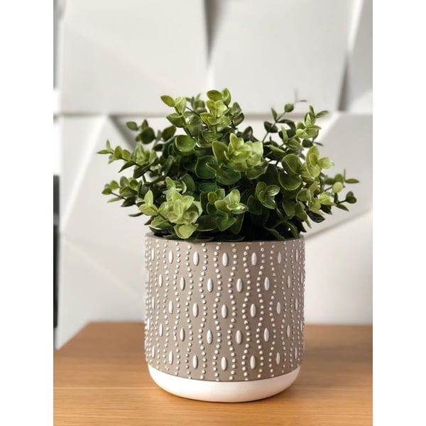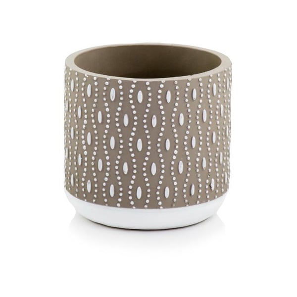 Cilindrična keramička posuda. Materijal od kojeg je izrađen podsjeća na teksturu betona - brojne ogrebotine i pore na površini namjerni su elementi dizajna. Minimalizam i prirodnost snaga su i ljepota ove navlake za lonce - ona ne nadjačava biljke izložene unutar nje. Ovaj će članak izgledati sjajno u interijerima s boho vibrom ili među modernijim uređenjem. Predstavljeni poklopac lonca služi kao ukrasni štit - biljke se ne smiju saditi izravno u njega. Više informacija možete pronaći u kartici tehničke specifikacije. Proizvodi su ručni rad i stvarne dimenzije mogu malo odstupati od deklariranih (+/- 5%).