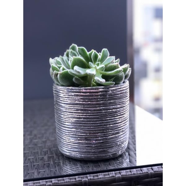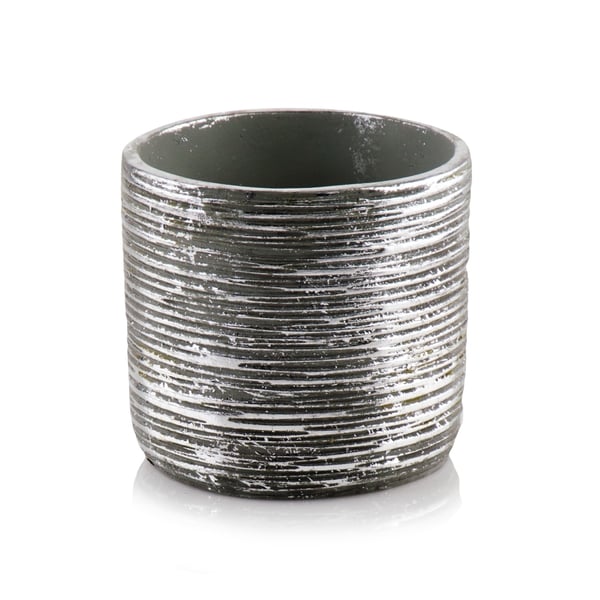 Keramička posuda u obliku cilindra s originalnom teksturom koja stvara prekrasan efekt starog, ali još uvijek sjajnog srebra. Poklopac može držati biljku srednje veličine - kao što je orhideja, sansevieria u obliku mača ili prijateljska i poznata paprat. Prikazani lonac služi kao ukrasni pokrov - biljke se ne smiju saditi izravno u njega. Više informacija možete pronaći u kartici tehnički podaci. Proizvodi su ručni rad i stvarne dimenzije mogu malo odstupati od deklariranih (+/- 5%).