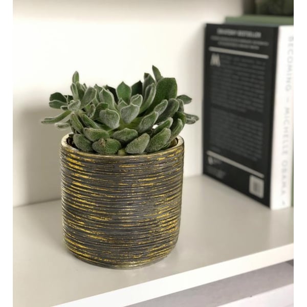 Keramička posuda u obliku cilindra, originalne teksture koja stvara prekrasan efekt starog, ali još uvijek sjajnog zlata. Na pokrov može stati biljka srednje veličine - to može biti orhideja, sansevieria u obliku mača ili prijateljska i poznata paprat. Prikazani lonac služi kao ukrasni pokrov - biljke se ne smiju saditi izravno u njega. Više informacija možete pronaći u kartici tehnički podaci. Proizvodi su ručni rad i stvarne dimenzije mogu malo odstupati od deklariranih (+/- 5%).