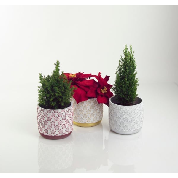 Keramička cilindrična posuda za biljke s božićnim motivom. Proizvod je izrađen od neglazirane keramike i svojom teksturom podsjeća na beton. Zidovi su ukrašeni zvjezdastim uzorcima. Kontejner treba koristiti kao pokrov, a ne za sadnju izravno u njemu. Više informacija možete pronaći u kartici tehnički podaci. Proizvodi su ručni rad i stvarne dimenzije mogu malo odstupati od deklariranih (+/- 5%).