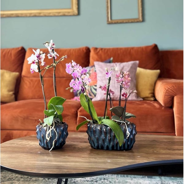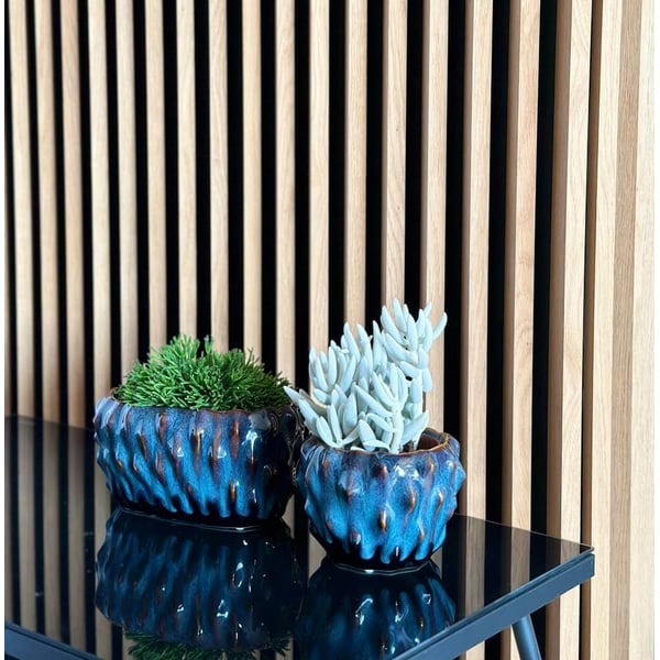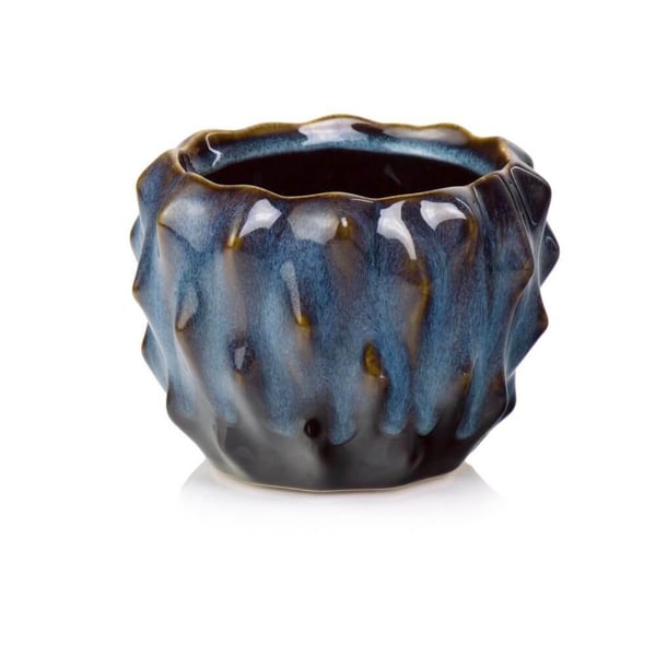 Okrugla, zdepasta žardinjera izrađena od glazirane keramike. Njegova ostakljena površina sjaji u nijansama smeđe i plave, stvarajući zadivljujući kontrast. Ima izbočene šiljke posvuda, što mu daje jedinstven karakter. Ovi suptilni elementi dodaju modernost i privlače pozornost. Lonac ima brojne nesavršenosti glazure kao što su pukotine, delikatne ureznice i nepravilnosti - namjerno dizajnirane da keramici daju šarm i jedinstvenost. U nju možete postaviti svoje omiljene biljke i cvijeće, stvarajući prekrasne aranžmane. Našu žardinjeru ne samo da ćete cijeniti, već ona može biti i savršen poklon za ljubitelje dizajna i vrtlarstva. Više informacija možete pronaći u kartici tehnički podaci. Proizvodi su ručni rad i stvarne dimenzije mogu malo odstupati od deklariranih (+/- 5%).