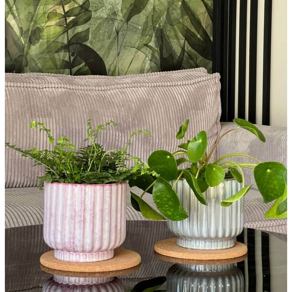 Posuda izrađena od kvalitetne glazirane keramike. Njegova sjajna površina reflektira svjetlost i stvara impresivne refleksije. Dno žardinjere je suženo, što mu daje osjećaj laganosti. Svijetloružičasta boja prošarana je nježnim nijansama bijele, dodajući suptilnost i stil. Posuda se ističe svojim okomitim izbočinama i nježnim prugama, što joj daje jedinstven karakter. Lonac ima brojne nesavršenosti glazure kao što su pukotine, delikatna udubljenja i neravnine - namjerne tehnike koje keramici daju šarm i jedinstvenost. Čvrsta baza osigurava stabilnost. Možete ga postaviti na bilo koje mjesto u vašem domu ili uredu. Više informacija možete pronaći u kartici tehničke specifikacije. Ovi proizvodi su ručni rad i stvarne dimenzije mogu malo odstupati od deklariranih (+/- 5%).