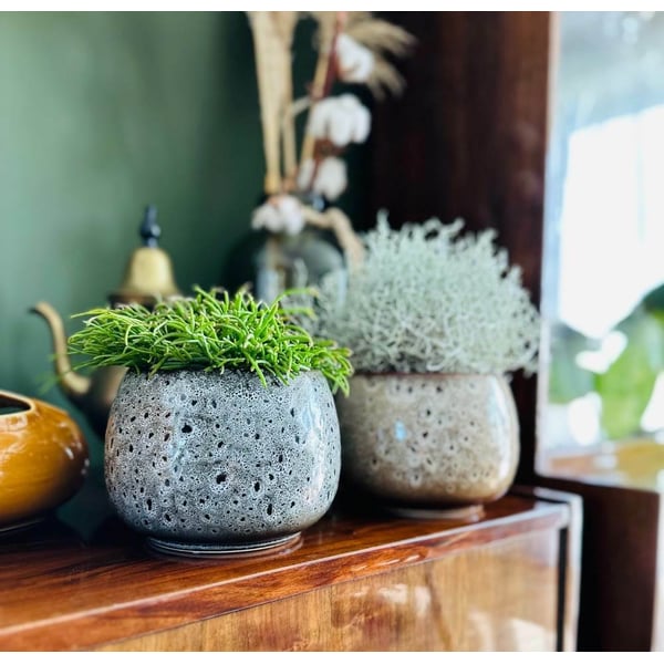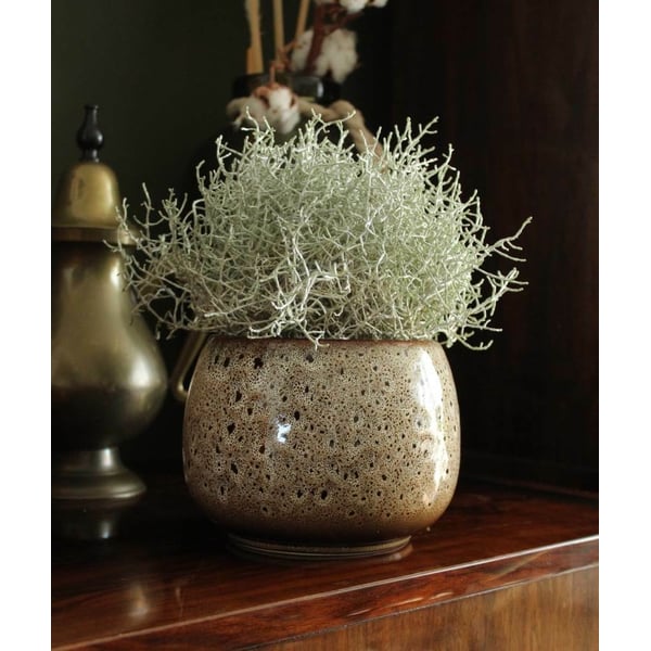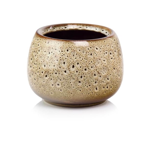 Okrugla, zdepasta žardinjera izrađena od visokokvalitetne glazirane keramike. Ne samo da impresionira svojim lijepim oblikom, već i suptilnim detaljima koji ga ističu. Sjajna površina u smeđoj i bijeloj boji sa suptilnim crnim mrljama dodaje dašak elegancije. Njegov zdepast oblik osigurava stabilnost. Proizvod ima brojne nesavršenosti glazure (pucketanja), delikatne inkluzije i nepravilnosti - ova namjerna tehnika daje keramici šarm ručne izrade i jedinstvenost. Naša žardinjera također je savršen poklon za ljubitelje dizajna i biljaka. Više informacija možete pronaći u kartici tehnički podaci. Proizvodi su ručni rad i stvarne dimenzije mogu malo odstupati od deklariranih (+/- 5%).
