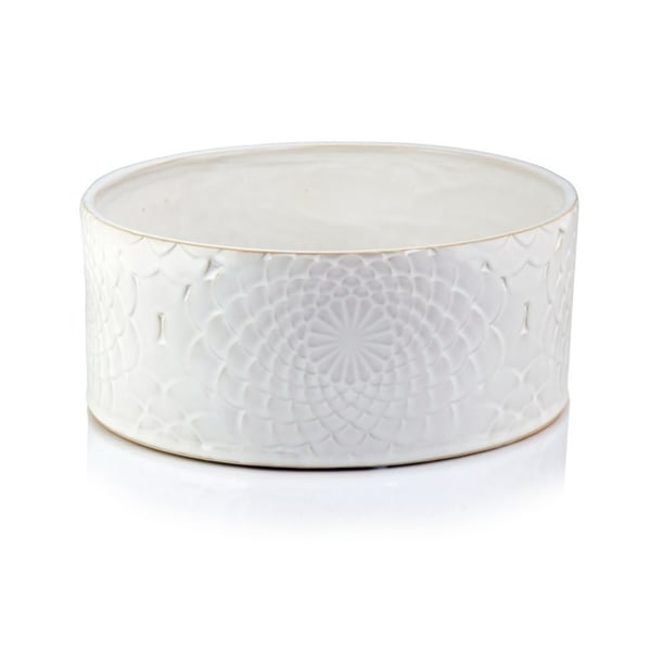 Niska okrugla keramička žardinjera s glaziranom završnom obradom koja joj daje jedinstveni sjaj i izdržljivost. Delikatni uzorak na površini dodaje šarm i suptilnost, čineći ga ne samo funkcionalnim elementom, već i ukrasom samim po sebi. Ova sjajna žardinjera dostupna je u nekoliko šarmantnih boja: bijeloj, svijetlozelenoj, tirkiznoj i tamnoplavoj, što vam omogućuje da je uskladite s bilo kojim interijerom i stilom. Proizvod ima brojne pukotine, delikatna udubljenja i neravnine u glazuri, što mu daje šarm ručne izrade i unikatnost. Zahvaljujući zdjelastom obliku i odgovarajućoj dubini, savršen je za izradu većih cvjetnih aranžmana. Za više informacija pogledajte karticu tehničkih podataka. Proizvodi su ručni rad i stvarne dimenzije mogu malo odstupati od deklariranih (+/- 5%).