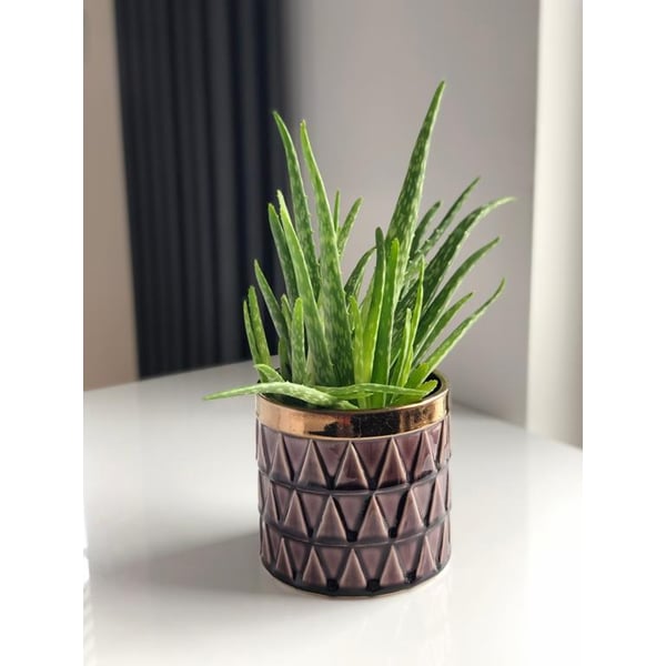 Keramička posuda u obliku cilindra. Proizvod je izrađen od visokokvalitetne glazirane keramike - gornji rub je završen tamno zlatnom bojom, dok se na središnjem dijelu nalaze geometrijski uzorci u raznim nijansama ljubičaste. Cijeli je komad ukrašen finom mrežom pukotina i sitnih rupica, dodajući dašak elegancije i jedinstvenosti. Više informacija možete pronaći u kartici tehnički podaci. Proizvodi su ručni rad pa stvarne dimenzije mogu neznatno odstupati od deklariranih (+/- 5%).