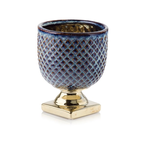 Posuda kalež izrađena je od visokokvalitetne glazirane keramike - baza je završena u zlatnoj boji, dok je gornji dio u raznim nijansama plave boje. Naravno, žardinjera može poslužiti i za uzgoj raznih biljaka, ali i kao ukrasni element za cvjetne aranžmane ili kao ukrasna posuda za razne predmete. Više informacija možete pronaći u kartici tehnički podaci. Proizvodi su ručni rad i stvarne dimenzije mogu malo odstupati od deklariranih (+/- 5%).