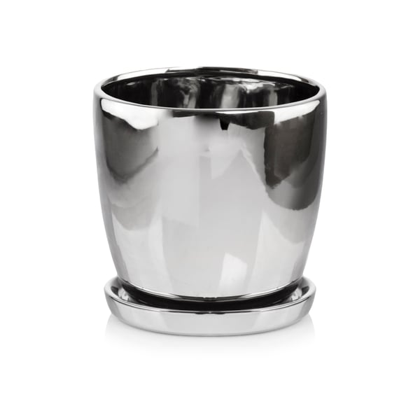 Okrugli set keramičkih posuda s postoljem. Artikal je izrađen od keramike tankih stijenki i završne obrade visokokvalitetnom zrcalno-srebrnom glazurom. Zahvaljujući postupku galvanoplastike, površina proizvoda je glatka i reflektira okolinu poput ogledala. Posuda je jednostavnog oblika, vrlo funkcionalnog oblika (ostavlja dovoljno mjesta za korijenski sustav) i nema nikakvih ukrasa. Stilski je univerzalna - prikladna i za klasično i za moderno uređene interijere. Proizvod ima rupu na dnu za odvod viška vode, a baza je trajno pričvršćena na žardinjeru. Više informacija možete pronaći u kartici tehničke specifikacije. Proizvodi su ručni rad i stvarne dimenzije mogu malo odstupati od deklariranih (+/- 5%).