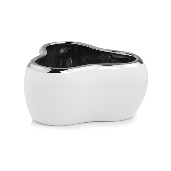 Posuda nepravilnog oblika. Artikl je izrađen od keramike tankih stijenki i završne obrade visokokvalitetnom zrcalno-srebrnom glazurom. Zahvaljujući procesu galvanizacije, površina proizvoda je glatka i reflektira okolinu poput ogledala. Završna obrada "White & silver" - elektrolitičko srebro koje daje metalik karakter, nalazi se na rubovima i unutar artikla. Preostali dio vanjske površine izrađen je od bijele glazure. Posuda je dizajnirana za držanje tri orhideje (standardna veličina plastične proizvodne posude). Naravno, ovaj artikl se može koristiti i za uzgoj drugih biljaka, kao posuda za cvjetne aranžmane ili jednostavno kao posuda za odlaganje raznih stvari. Artikli kolekcije Moon stilski su detalji koji stvaraju ekskluzivnu atmosferu u glamuroznom stilu. Kreirani su imajući na umu kupce koji cijene ljepotu i estetiku. Više informacija možete pronaći u kartici tehnički podaci. Proizvodi su ručne izrade i stvarne dimenzije mogu malo odstupati od deklariranih (+/- 5%).