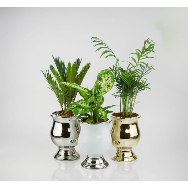 Posuda u obliku amfore. Artikal je izrađen od keramike tankih stijenki i završne obrade visokokvalitetnom zrcalno zlatnom glazurom. Zahvaljujući procesu galvanizacije, površina proizvoda je glatka i reflektira okolinu poput ogledala. Elektrolitičko zlato, koje proizvodu daje metalni karakter, prisutno je na cijeloj površini, uključujući i unutrašnjost. Ovaj model dizajniran je za prilagodbu plastičnog poklopca standardne veličine za proizvodnju orhideja. Naravno, žardinjera se može koristiti i za uzgoj drugih biljaka, kao dio cvjetnih aranžmana ili kao ukrasna posuda za razne predmete. Više informacija možete pronaći u kartici tehničke specifikacije. Proizvodi su ručni rad i stvarne dimenzije mogu malo odstupati od deklariranih (+/- 5%).