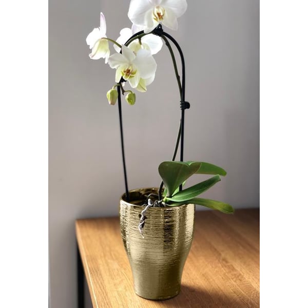Posuda s okruglom bazom i oblikom nalik na tulipan. Artikl je izrađen od keramike tankih stijenki i završen visokokvalitetnom zrcalno zlatnom glazurom. Posuda je dizajnirana za smještaj orhideja (standardna veličina plastične posude za proizvodnju). Posuda se također može koristiti za uzgoj drugih biljaka, kao i posuda za cvjetne aranžmane ili jednostavno kao posuda za odlaganje raznih predmeta. Više informacija možete pronaći u kartici tehnički podaci. Proizvodi su ručni rad i stvarne dimenzije mogu malo odstupati od deklariranih (+/- 5%).