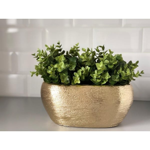 Dugačka ovalna posuda. Artikal je izrađen od keramike tankih stijenki i završne obrade visokokvalitetnom zrcalno zlatnom glazurom. Posuda je dizajnirana za držanje 2 orhideje, ali se može koristiti i za uzgoj drugih biljaka. Također će savršeno funkcionirati kao dio cvjetnog aranžmana ili kao ukrasna posuda za razne predmete. Više informacija možete pronaći u kartici tehnički podaci. Proizvodi su ručni rad i stvarne dimenzije mogu malo odstupati od deklariranih (+/- 5%).