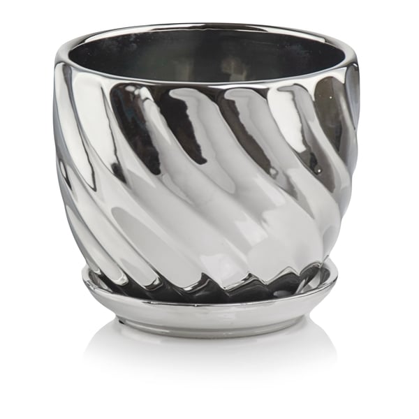 Okrugla posuda s uključenom bazom. Artikal je izrađen od keramike tankih stijenki i završne obrade visokokvalitetnom zrcalno-srebrnom glazurom. Zahvaljujući procesu galvanizacije, površina proizvoda je glatka i reflektira okolinu poput zrcala. Elektrolitičko srebro, koje daje metalni karakter, prisutno je na cijeloj površini predmeta, uključujući i unutrašnjost. Posuda ima otvor za drenažu i trajno je pričvršćena za podlogu. Artikli kolekcije Moon stilski su detalji koji stvaraju ekskluzivnu atmosferu u glamuroznom stilu. Kreirani su imajući na umu klijente koji posebno cijene ljepotu i estetiku. Promjer: 14cm Visina: 13cm Više informacija možete pronaći u kartici tehnički podaci. Proizvodi su ručne izrade i stvarne dimenzije mogu malo odstupati od deklariranih (+/- 5%).
