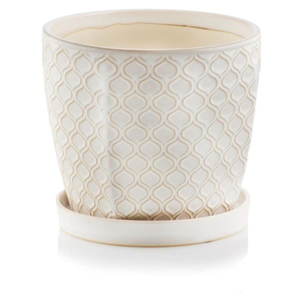 Okrugla posuda s uključenom podlogom. Proizvod je izrađen od visokokvalitetne glazirane keramike. Na dnu žardinjere nalazi se rupa za drenažu. Više informacija možete pronaći u kartici tehničke specifikacije. Proizvodi su ručne izrade i stvarne dimenzije mogu malo odstupati od deklariranih (+/- 5%).