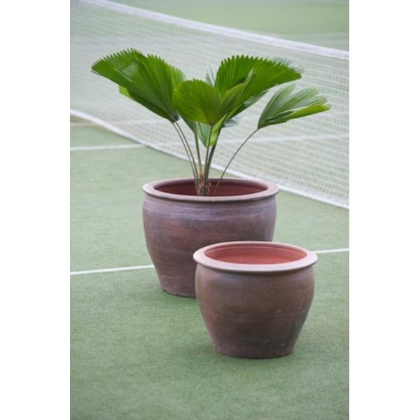 Velika posuda lonac s okruglim dnom. Izrađena od tamno smeđe terakote. Zahvaljujući odabiru odgovarajuće vrste gline, vrlo visokoj temperaturi u peći (iznad 1100 stupnjeva Celzijusa), te pravilnom postupku pečenja, posuda je otporna na mraz. Korištenje u vrtovima tijekom cijele godine neće biti problem. Zahvaljujući svojoj čvrstoći savršeno će funkcionirati iu javnim prostorima. Artikal je vrlo čvrsto izrađen i funkcionalnog oblika - ima dovoljno mjesta za korijenski sustav čak i vrlo velikih biljaka. Uz odgovarajući raspored, posuda će svakako dati južnjački karakter okolini u kojoj će biti postavljena. Proizvodi su ručni rad i stvarne dimenzije mogu malo odstupati od deklariranih (+/- 10%). Na dnu je pripremljena rupa za otjecanje viška vode, koja se po potrebi može začepiti hidroizolacijom. Ovaj model također ima mogućnost kupnje originalnog stalka (broj proizvoda 75.027). Informacije o tome koji promjer stalka odgovara odabranoj veličini posude možete pronaći u kartici tehnički podaci.