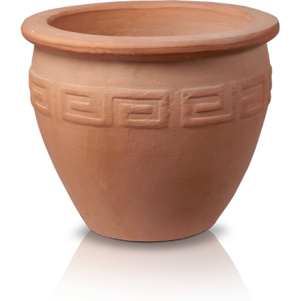 Velika žardinjera s okruglom bazom i uzorkom. Proizvod je izrađen od neglazirane keramike. Zahvaljujući odabiru odgovarajuće vrste gline, visokoj temperaturi u peći (iznad 1000 stupnjeva Celzijusa) i pravilnom postupku pečenja, žardinjera je otporna na mraz. Stoga neće biti problem koristiti ga u vrtovima tijekom cijele godine. Artikl je izrađen od organskog materijala koji reagira s vodom, zemljom i kemikalijama, uzrokujući pojavu privremenih naslaga na površini ovisno o uporabi. To je potpuno prirodan proces koji uz biljku stvara jedinstvenu atmosferu. Žandarmerija će zasigurno dati mediteranski karakter ambijentu u kojem će biti izložena. Na zidovima je podignuta dekoracija - grčki uzorak. Artikal ima malu rupu za odvod viška vode, koja se po potrebi može začepiti vodonepropusnom tvari. Više informacija možete pronaći u kartici tehnički podaci. Proizvodi su ručni rad i stvarne dimenzije mogu malo odstupati od deklariranih (+/- 10%). Za produljenje životnog vijeka žardinjere preporuča se dodatno zaštititi unutarnje stijenke tekućim filmom prije sadnje.