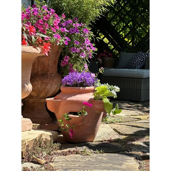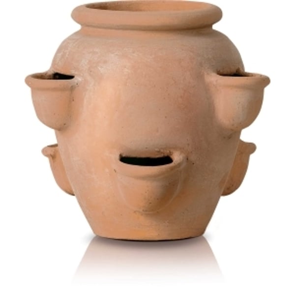 Okrugla Tuscan posuda s otvorima. Proizvod je izrađen od neglazirane keramike - organskog materijala koji reagira s vodom, podlogom i kemikalijama, uzrokujući pojavu prirodnih naslaga na površini ovisno o upotrebi. To je potpuno prirodan proces koji u kombinaciji s biljkama stvara jedinstvenu atmosferu. Ova posuda će svakako dodati mediteranski štih svakom ambijentu u kojem se izloži. Zahvaljujući bočnim "džepovima", ovaj model je posebno pogodan za uzgoj različitog začinskog bilja. Na dnu postoji mala rupa za odvod viška vode, koja se po potrebi može zatvoriti vodootpornom tvari. Promjer: 40cm Visina: 35cm Dajemo vanjske dimenzije na najširim točkama artikla. Za više informacija pogledajte karticu tehničkih podataka. Proizvodi su ručni rad i stvarne dimenzije mogu malo odstupati od deklariranih (+/- 10%). Ovaj model je sezonska vrtna žardinjera - što znači da nije zajamčeno da će izdržati mraz i preporučuje se zaštititi ga tijekom zime - uklanjanjem od izravnog izlaganja vremenskim uvjetima (npr. skladištenje pod pokrovom, pokrivanje itd.). Za produljenje vijeka trajanja žardinjere savjetuje se prije sadnje unutarnje stijenke dodatno zaštititi tekućom folijom.