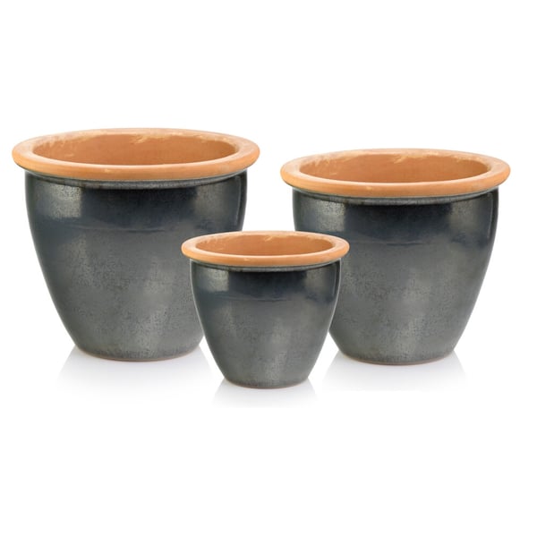 Glazirana keramička posuda s debelim rubom. Zahvaljujući odabiru prave vrste gline, vrlo visokoj temperaturi u peći (iznad 1150 stupnjeva Celzijusa) i odgovarajućem procesu pečenja, posuda je 100% otporna na mraz. Korištenje u vrtovima tijekom cijele godine stoga neće biti problem. Na dnu se nalazi mala rupa za odvod viška vode. U slučaju da rupa nije poželjna, može se zatvoriti npr. silikonom. Ovaj model ima vrlo funkcionalan oblik - ima dovoljno mjesta za korijenski sustav biljke. Artikli iz Glazirane kolekcije ručno su izrađeni od prirodnih materijala - mrlje od glazure, razne diskoloracije, nježne jamice, crackle glazura - dakle ne postoje dvije iste posude, svaki primjerak je unikat. Elegantan i univerzalan završetak dekoracije bilo kojeg mjesta. Posuda je savršena za izlaganje u privatnim vrtovima, kao i na javnim mjestima - ispred hotela, ureda ili restorana. Lonci čine set od tri komada. Za više informacija pogledajte karticu tehnički podaci. Proizvodi su ručni rad i stvarne dimenzije mogu malo odstupati od deklariranih (+/- 10%).