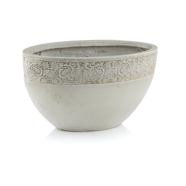 Velika posuda s ovalnim dnom. Materijal koji se koristi (eko-smola, vlaknasta glina) je kombinacija vlakana i keramike. Površinska struktura je blago porozna i ima neravnomjerno raspoređene delikatne rupičice, zahvaljujući čemu podsjeća na arhitektonski beton. Proizvod je relativno lagan, što je vrlo zgodno za kretanje, a istovremeno je dovoljno stabilan za korištenje u javnim prostorima. Lonac se ističe dekorativnim reljefom na obodu. Artikl nema odvod za vodu, ali keramička vlakna su toliko jak materijal da je moguće sami izbušiti rupu; pripremljena su odgovarajuća udubljenja na dnu. Pa odlučite sami treba li posuda imati rupu. Ovaj model je sezonska vrtna posuda; to jest, nema jamstva za otpornost na smrzavanje, a preporučljivo je zaštititi ga za zimu - ukloniti ga od izravnog izlaganja vremenskim prilikama (npr., sakriti ga ispod nadstrešnice, pokrivača itd.). Za više informacija pogledajte karticu tehnički podaci. Proizvodi su ručni rad, a stvarne dimenzije mogu neznatno odstupati od deklariranih (+/- 5%). Svaki komad dolazi s uputama za sadnju. Za produljenje vijeka trajanja posude preporuča se dodatno zaštititi unutrašnjost preparatom poput tekuće folije. Budući da su artikli iz kolekcije Ecolite izrađeni od prirodnog materijala (keramičkih vlakana), posude upijaju vlagu. Stoga se tijekom uporabe mogu pojaviti lokalne mrlje od vlage na površini koje se s vremenom osuše i ne ostavljaju traga. Ovo je prirodan proces kod ove vrste materijala i ne utječe na funkcionalnost posude.