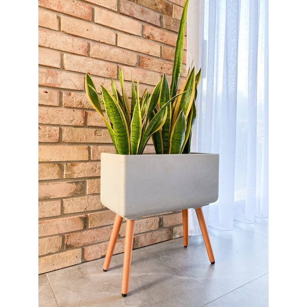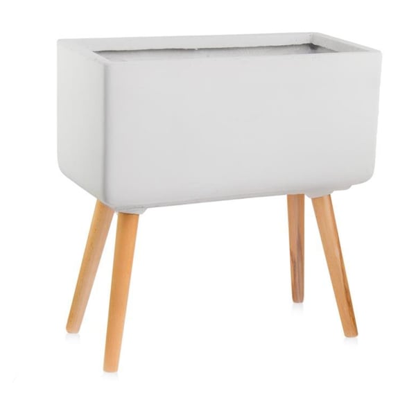 Dugačka, pravokutna žardinjera na drvenim nogama. Materijal koji se koristi su keramička vlakna, kombinacija gline i vlakana (ekološka smola, fiberclay). Noge su izrađene od visokokvalitetnog bukovog drveta. Površinska struktura zidova je blago porozna i ima neravnomjerno raspoređene nježne pore što daje izgled arhitektonskog betona. Proizvod je relativno lagan, što ga čini lakim za pomicanje, a opet vrlo stabilan. Noge se mogu odvrnuti za transport. Njegov izduženi oblik čini ga savršenim za odvajanje prostora kada je zasađen visokim biljkama. Artikli iz Ecolite Retro kolekcije nadopunjuju popularan trend među dizajnerima povratka stilu 60-ih i 70-ih. Promjer: 50x24cm Visina: 51cm Više informacija možete pronaći u kartici tehnički podaci. Proizvodi su ručni rad i stvarne dimenzije mogu malo odstupati od deklariranih (+/- 5%). Žadrilice iz kolekcije Ecolite Retro izrađene su od prirodnog materijala (keramičkih vlakana) i upijaju vlagu. Zbog toga se tijekom uporabe na površini mogu pojaviti lokalizirane mrlje od vlage koje će se s vremenom osušiti i ostaviti bez traga. Ovo je prirodan proces kod ove vrste materijala i ne utječe na funkcionalnost žardinjere.