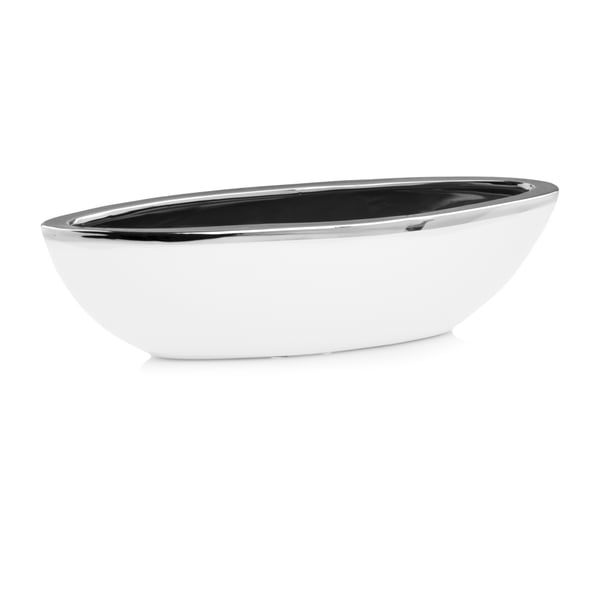 Dugačka posuda u obliku čamca. Artikl je izrađen od keramike tankih stijenki i završne obrade visokokvalitetnom zrcalno-srebrnom glazurom. Zahvaljujući procesu galvanizacije, površina proizvoda je glatka i reflektira okolinu poput zrcala. Završna obrada "White & silver" - elektrolitičko srebro koje daje metalik karakter, nalazi se na rubovima i unutar artikla. Preostali dio vanjske površine izrađen je od bijele glazure. Izvorno, ovaj model je dizajniran za cvjetne kompozicije, ali također savršeno funkcionira kao žardinjera za male biljke ili spremnik za spremanje raznih predmeta. Artikli kolekcije Moon stilski su detalji koji stvaraju ekskluzivnu atmosferu u glamur stilu. Stvoreni su imajući na umu kupce koji cijene ljepotu i estetiku. Više informacija možete pronaći u kartici tehnički podaci. Proizvodi su ručni rad i stvarne dimenzije mogu malo odstupati od deklariranih (+/- 5%).